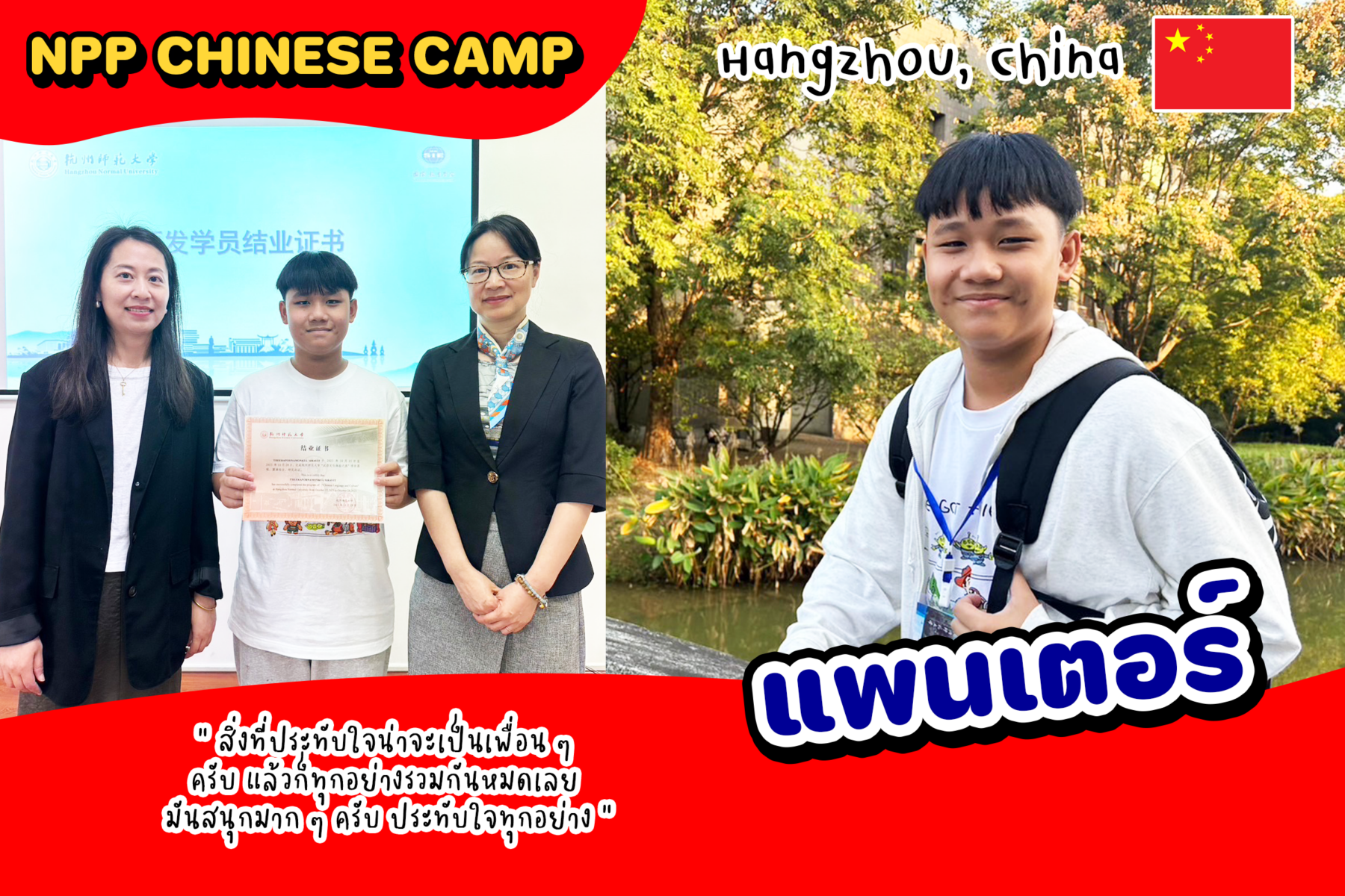 A : รู้จักกับ NPP เพราะว่า ผู้จัดแคมป์เป็นเพื่อนกับพ่อแม่ ทุกคนก็แนะนำ ผมก็สนใจอยากไปลองใช้ชีวิตที่ประเทศจีนโดยไม่มีพ่อแม่ไปครับ ก็อยากไปเจอเพื่อนที่นู่นดู